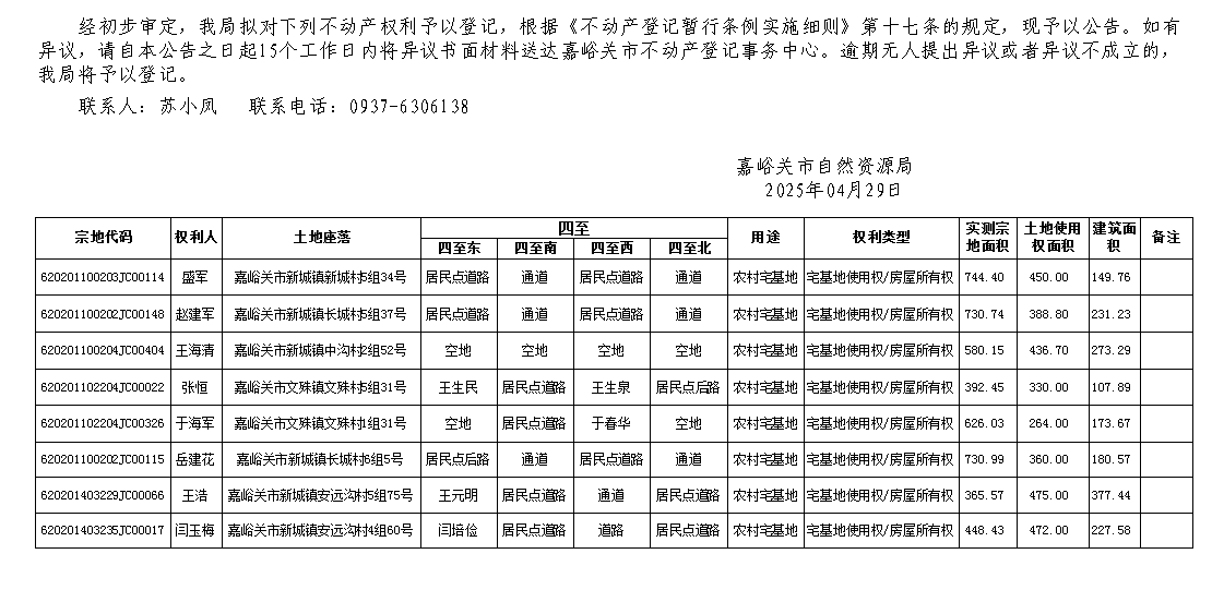 嘉峪关市农村宅基地使用权及房屋所有权首次登记公告