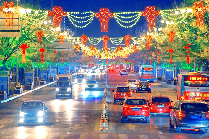 流光溢彩 虎年的脚步越来越近,我市以夜景亮化提升营造火树银花、喜庆祥和的新春氛围。 图为华灯初上的新华路。 本报记者 张杰 摄